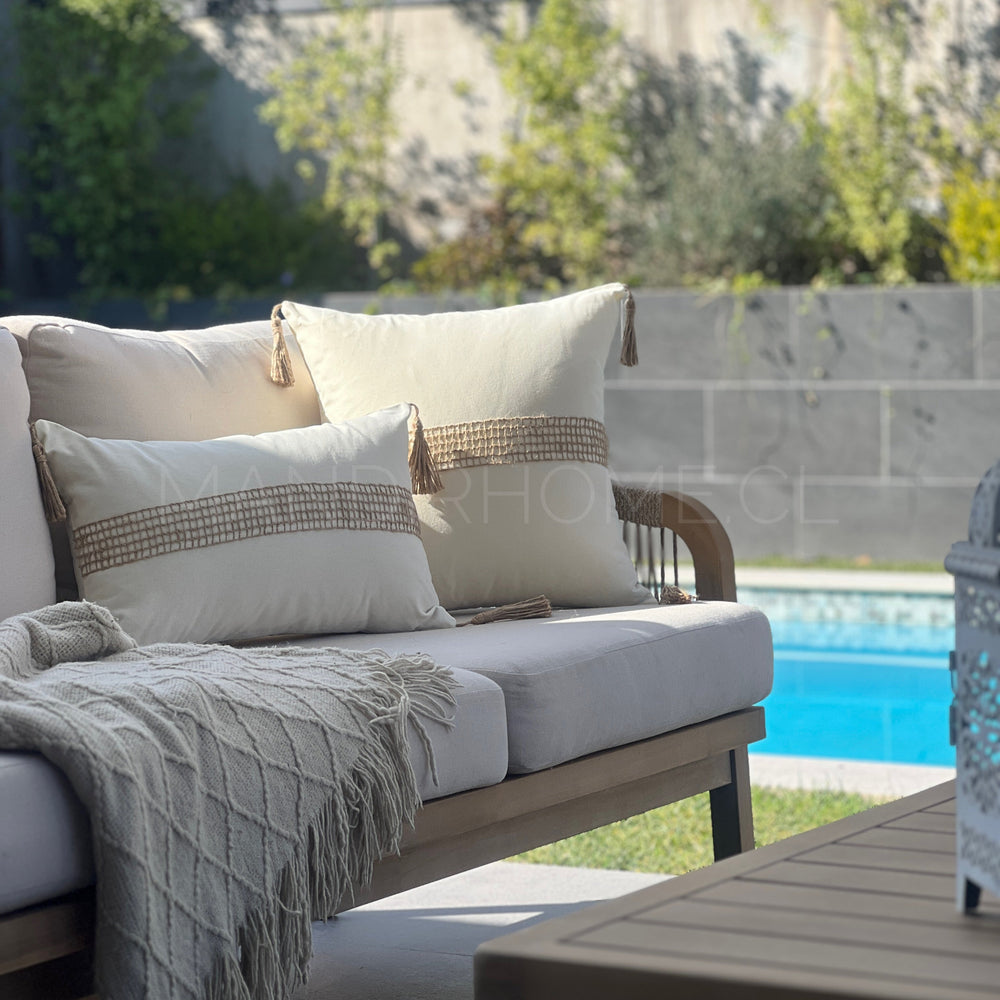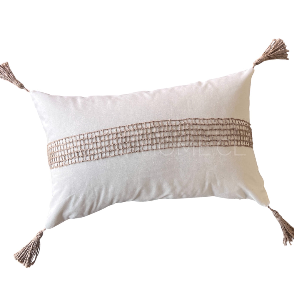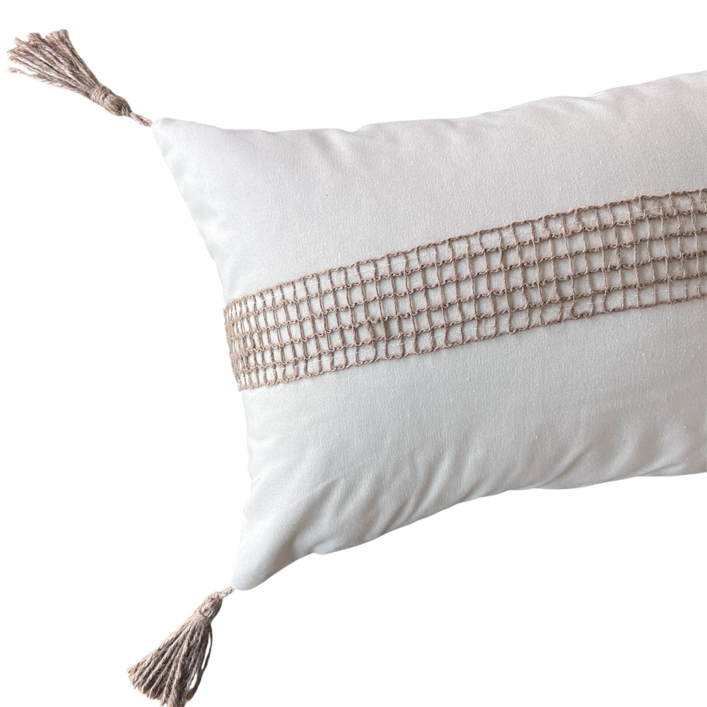 ¡Transforma la apariencia de tus cojines con nuestra hermosa funda de cojín de algodón con aplicaciones tejidas de yute! Aquí tienes más detalles: