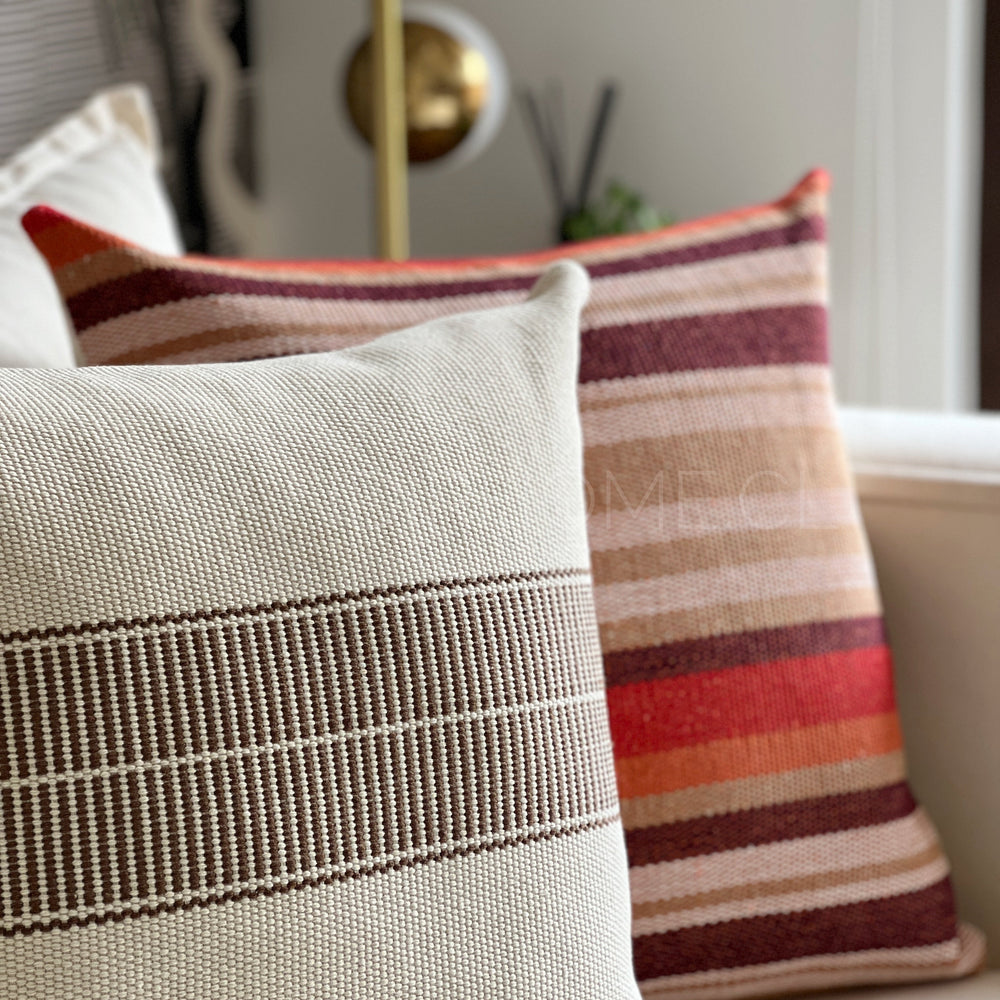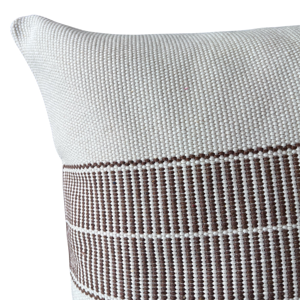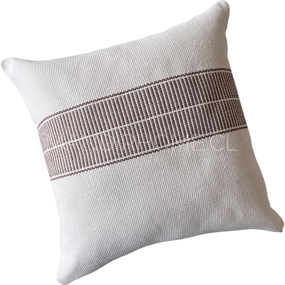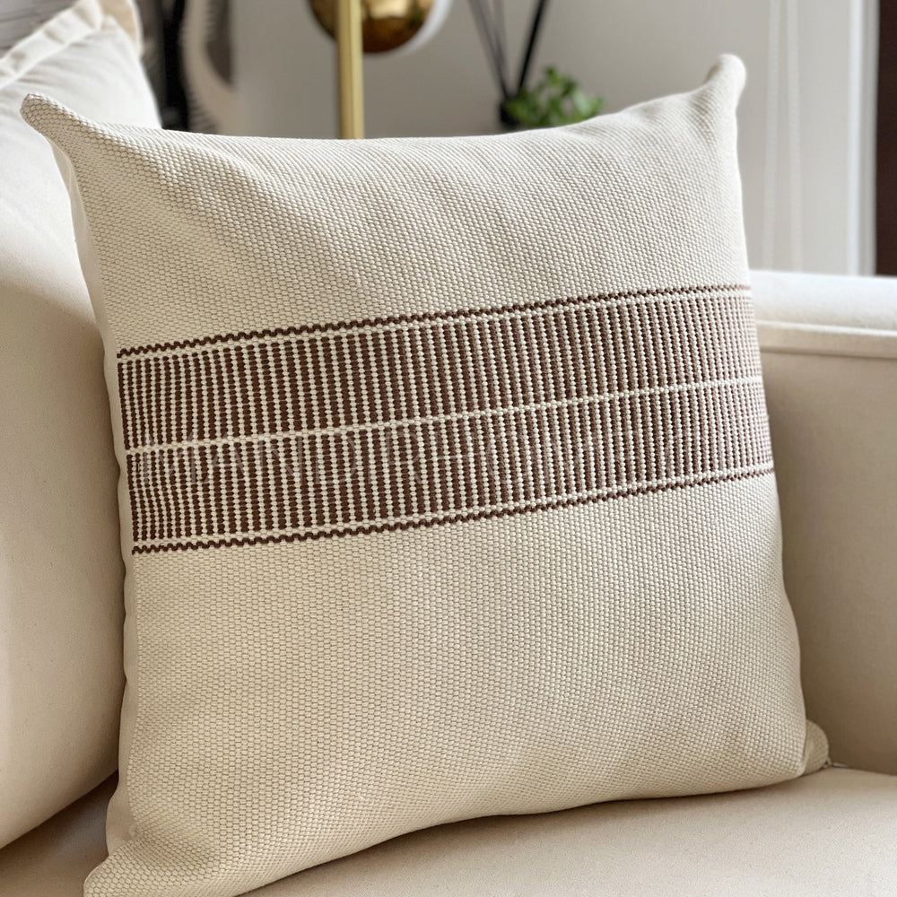 Añade un toque de sofisticación atemporal a tu espacio con nuestro cojín trama café, confeccionado en algodón 100% tejido estilo telar. Su diseño destaca por una franja vertical en negro profundo sobre una base cruda, creando un contraste sutil y moderno que se adapta a distintos estilos de decoración.