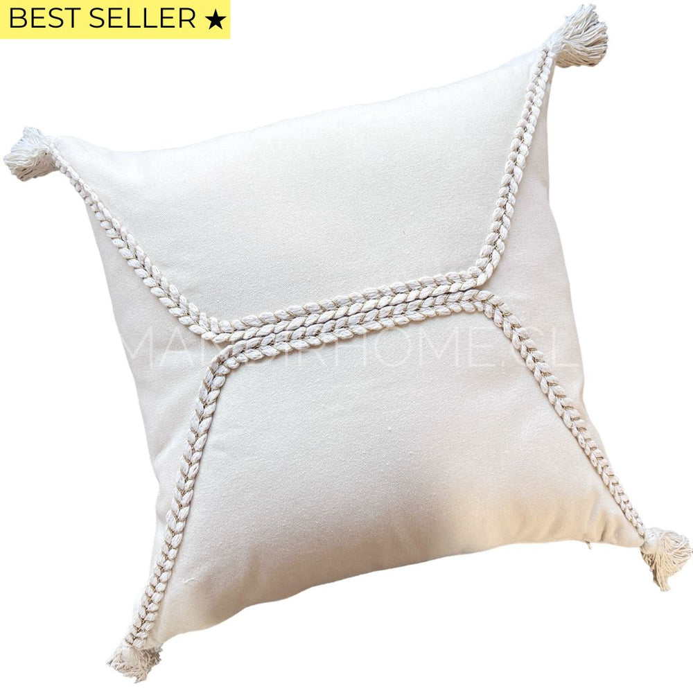 Añade un toque de elegancia y sofisticación a tu espacio con nuestra funda de cojín de algodón 100%, adornada con una trenza tejida en tonos crudos con sutiles toques dorados.