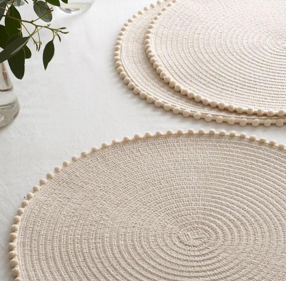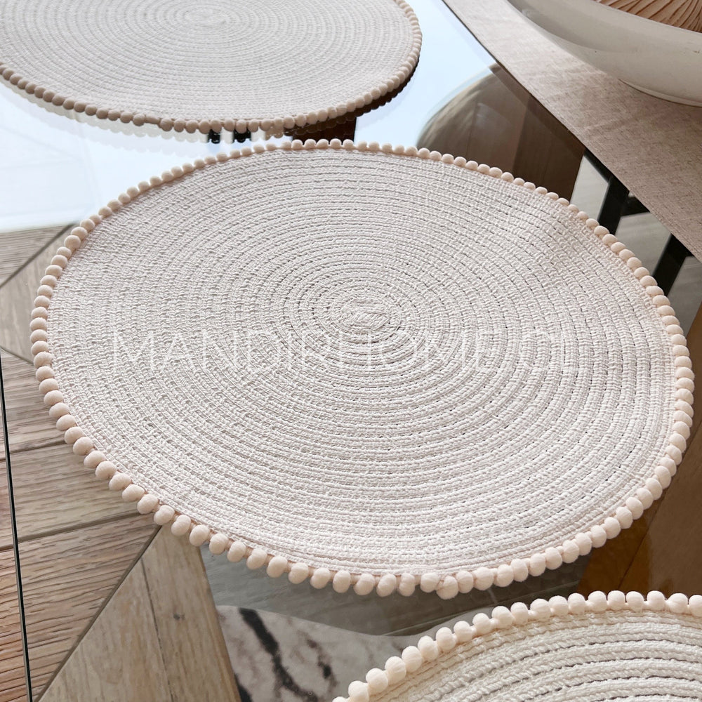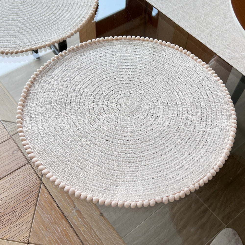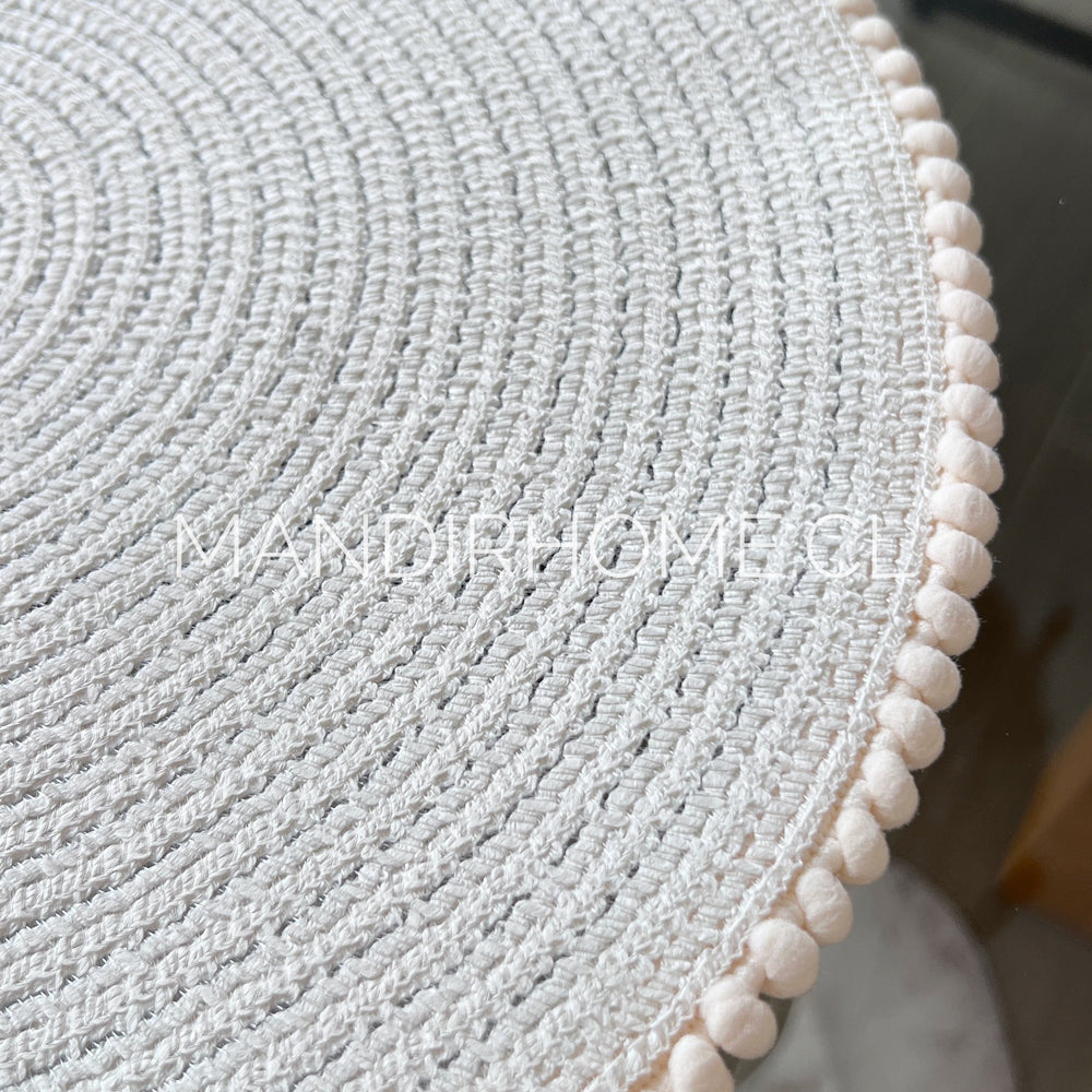 Dale un toque de sofisticación y estilo a tu mesa con nuestros Individuales Redondos de Tela en color crudo, decorados con encantadores pompones. El material flexible y resistente de estos individuales los hace ideales para cualquier ocasión, brindando un aspecto bellísimo a tus comidas. Perfectos para cenas formales o reuniones casuales, estos individuales aportan un detalle delicado que elevará la presentación de tu mesa.