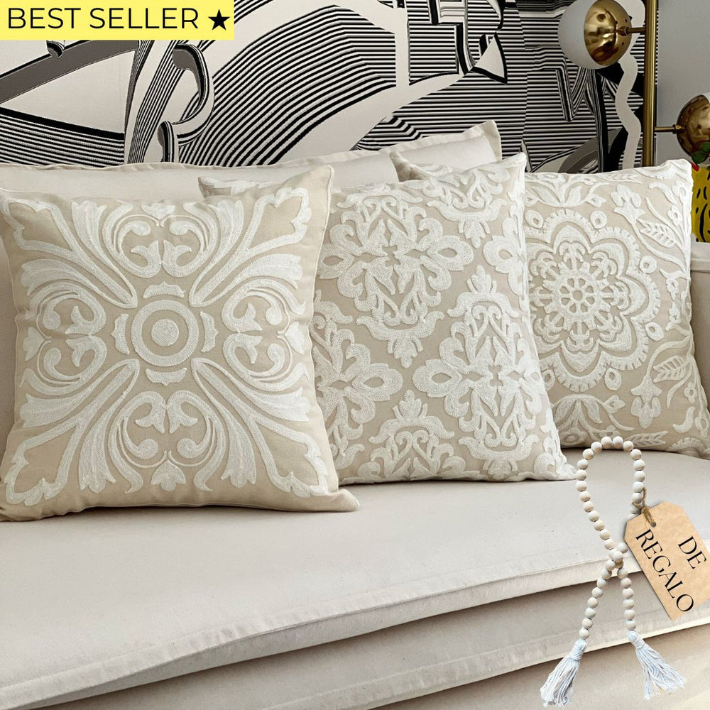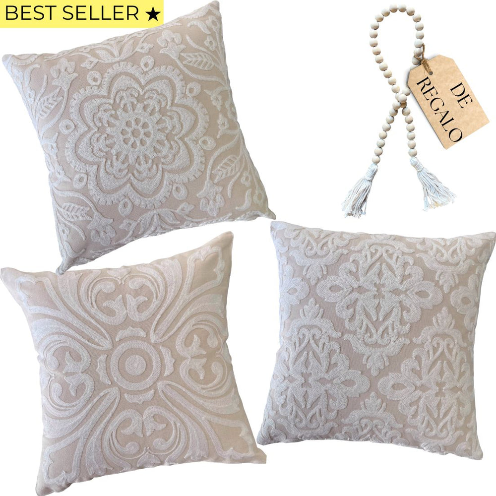 Dale un toque elegante y acogedor a tu living con nuestro set Las 3 Marías, compuesto por 3 fundas de cojín bordadas en tonos neutros, ideales para combinar con cualquier estilo de decoración.