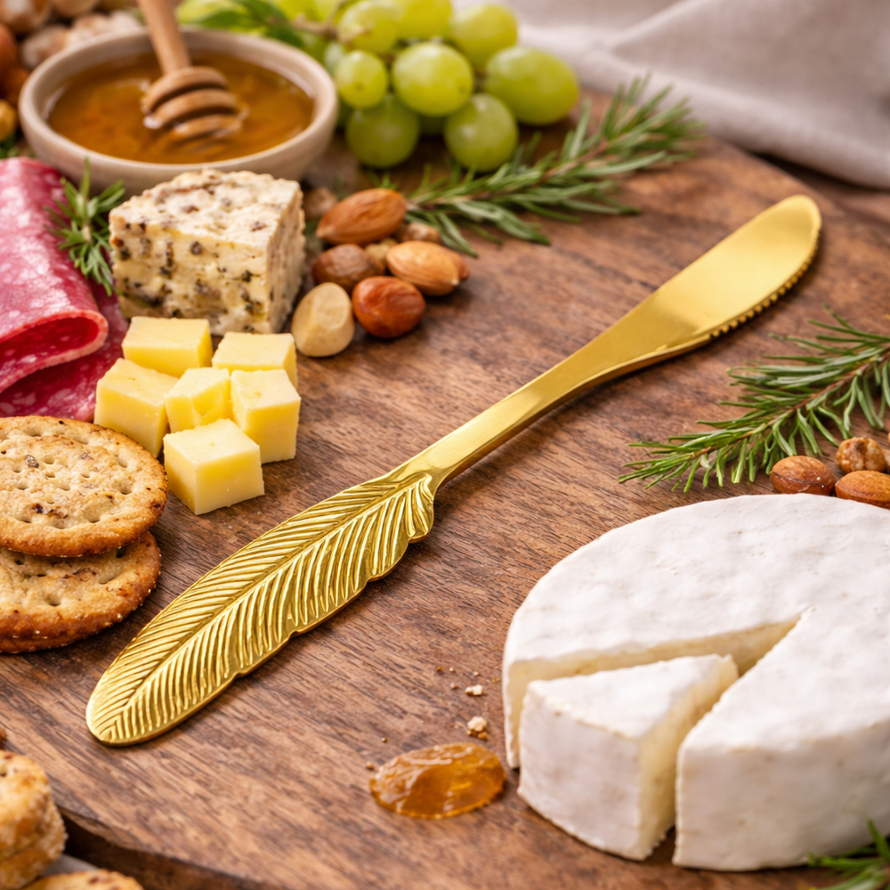 Agrega un toque elegante a tu mesa con este cuchillo para picoteo y queso con diseño pluma dorado. Perfecto para untar quesos, mantequilla, patés o acompañar tablas de aperitivo y cóctel.