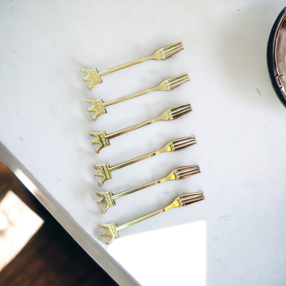 Tenedor de Picoteo Corona Dorado, fabricado con materiales de primera calidad. Estos tenedores de picoteo presentan un diseño único con una corona dorada que les da un toque moderno. Perfecto para servir postres pequeños, tortas y más. Duraderos, prácticos y bellos.