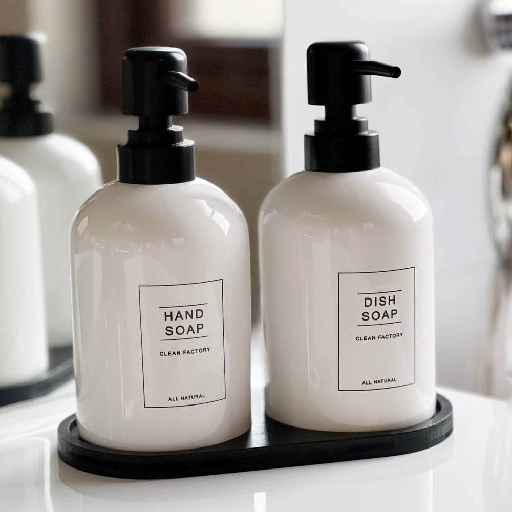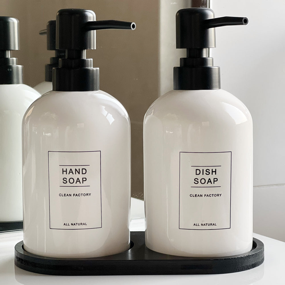 ¡Transforma tu cocina con nuestro elegante set dispensador de lavaloza y jabón de manos, que incluye una bandeja de bamboo! Adiós a las botellas de lavaloza y jabón que pueden arruinar la estética de tu cocina.